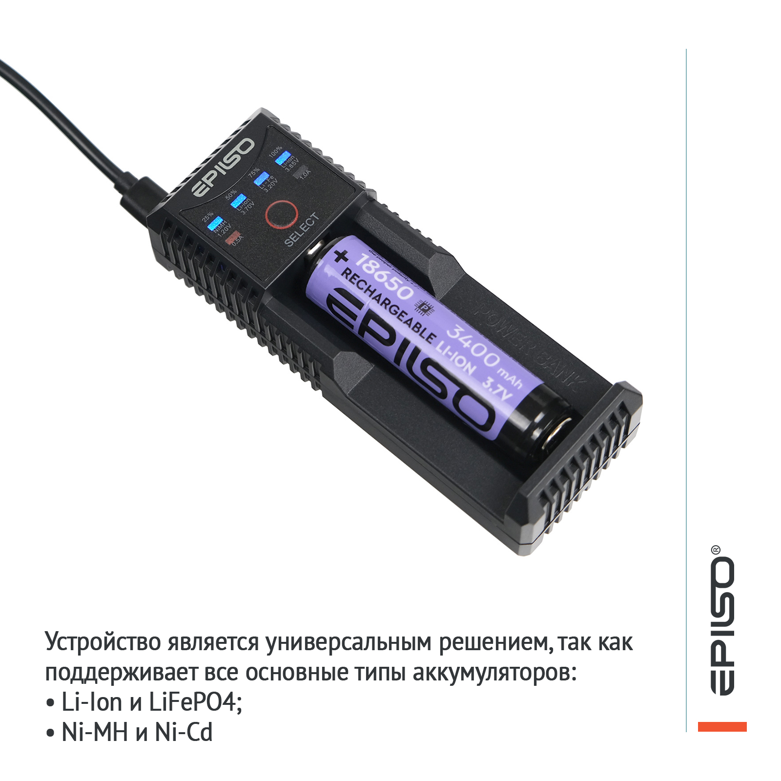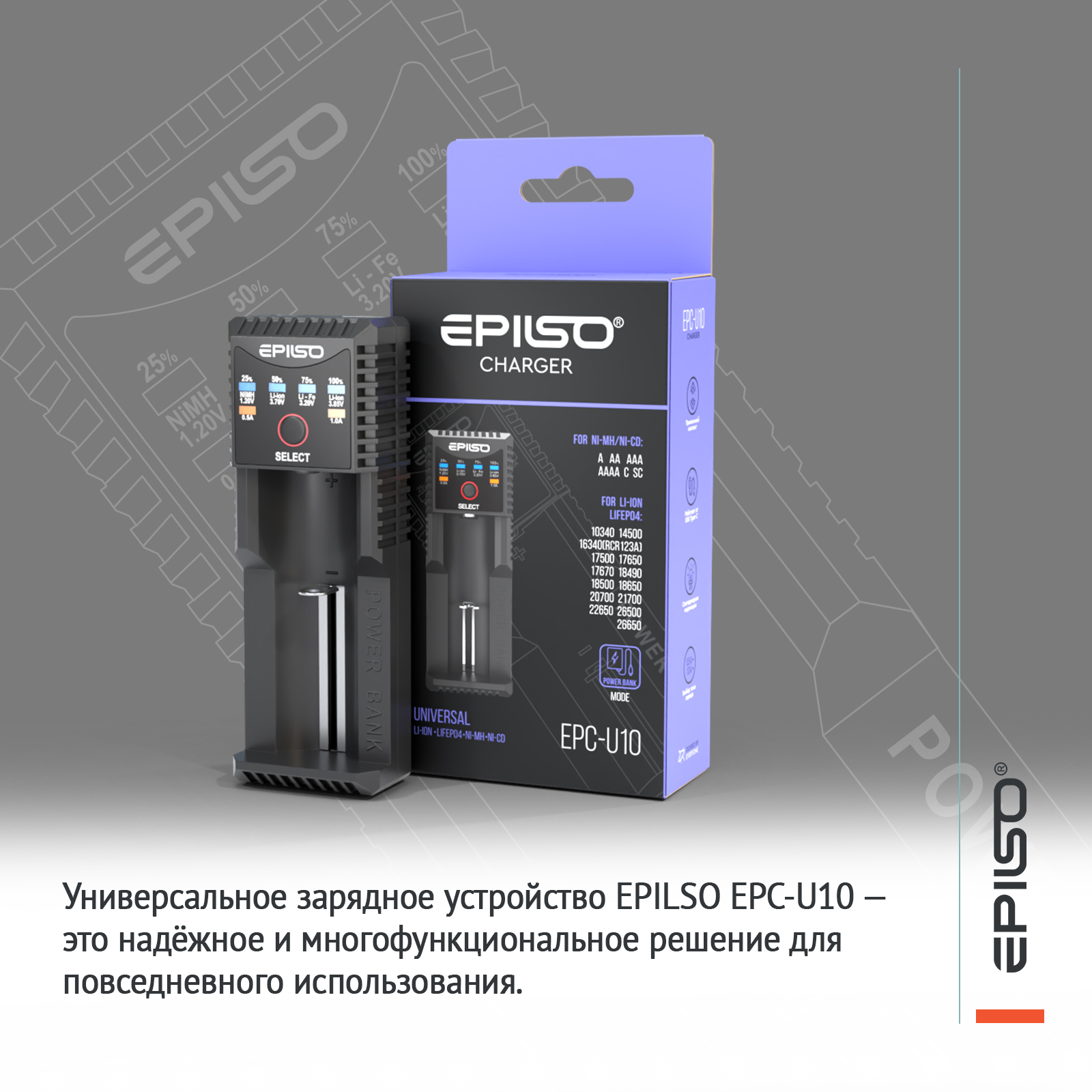 Универсальное зарядное устройство EPILSO EPC-U10 — это надёжное и многофункциональное решение для повседневного использования. Благодаря поддержке всех популярных типов аккумуляторов, продуманной системе индикации, ручному выбору тока, функции PowerBank и многоуровневой системе защит (от перезаряда, переразряда, короткого замыкания и перегрева), оно является отличным выбором для всех, кто ценит безопасность, удобство и универсальность.
