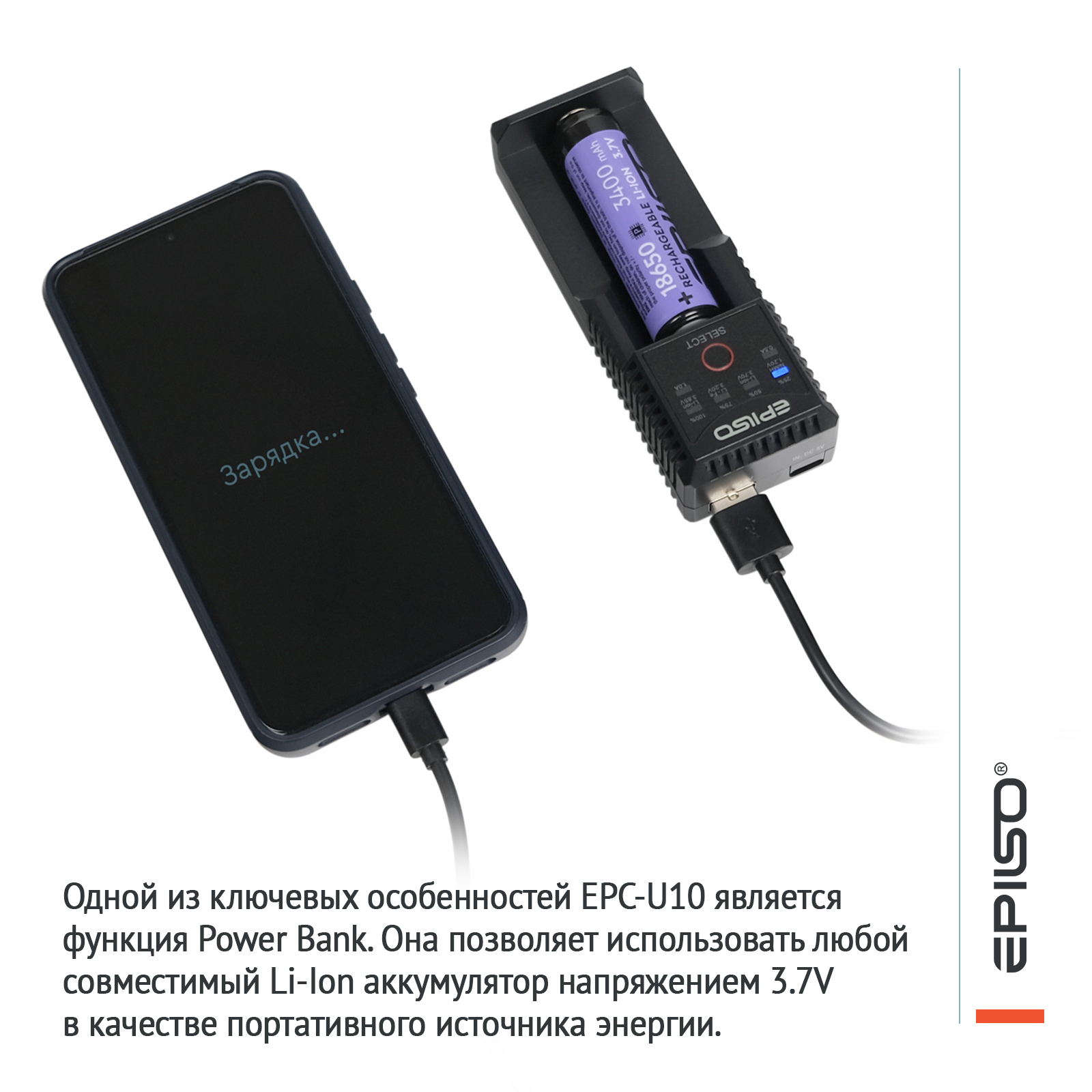 Одной из ключевых особенностей EPC-U10 является функция Power Bank. Она позволяет использовать любой совместимый Li-Ion аккумулятор напряжением 3.7V в качестве портативного источника энергии. Через встроенный USB-выход (5V/1A) можно заряжать мобильные телефоны, наушники и другие гаджеты, превращая зарядное устройство и аккумулятор в универсальное аварийное зарядное решение.