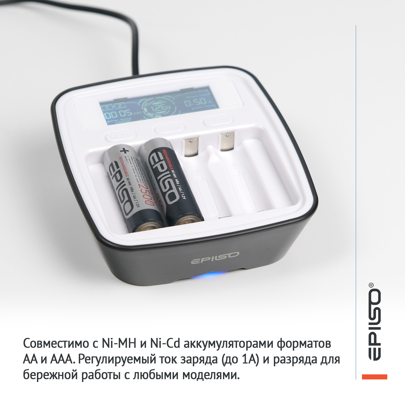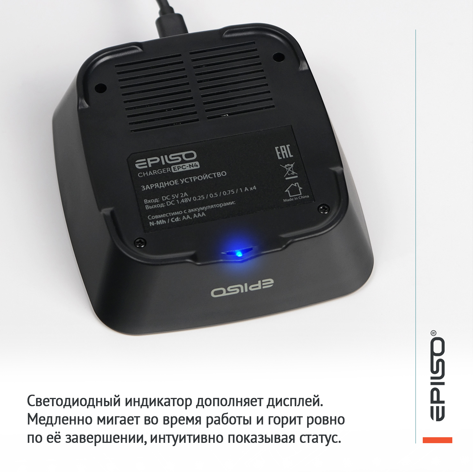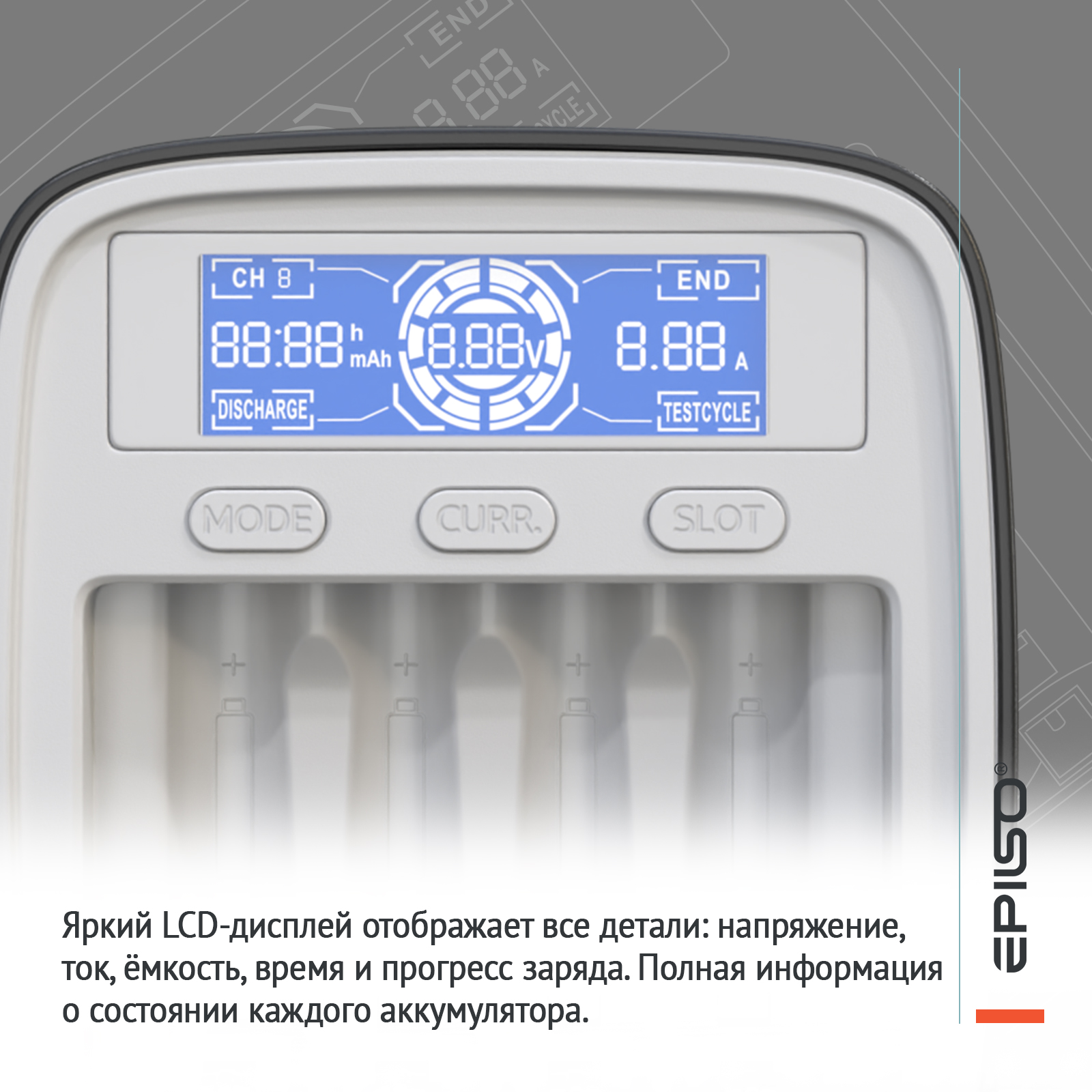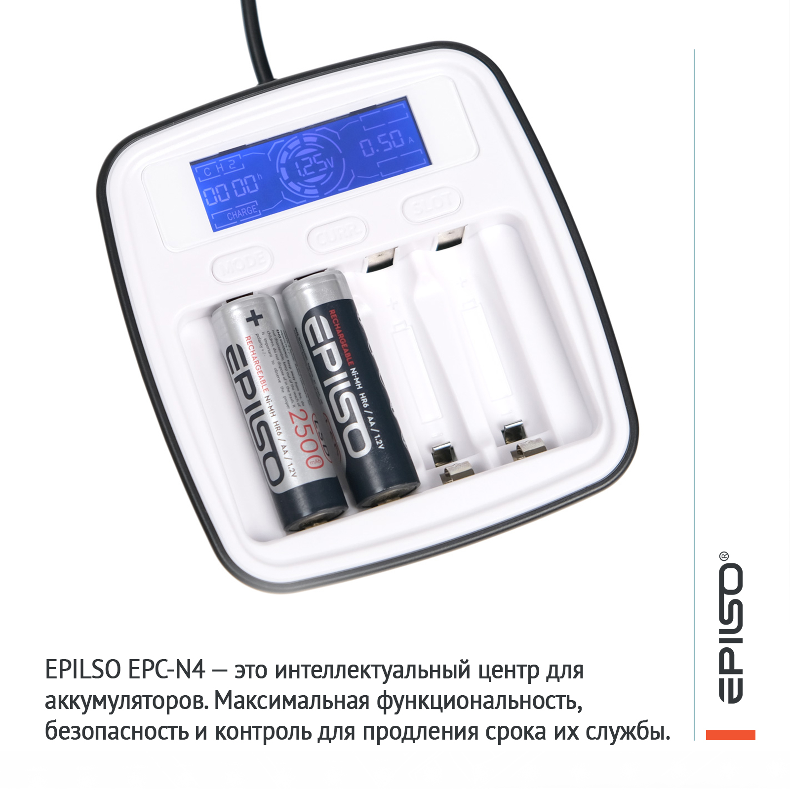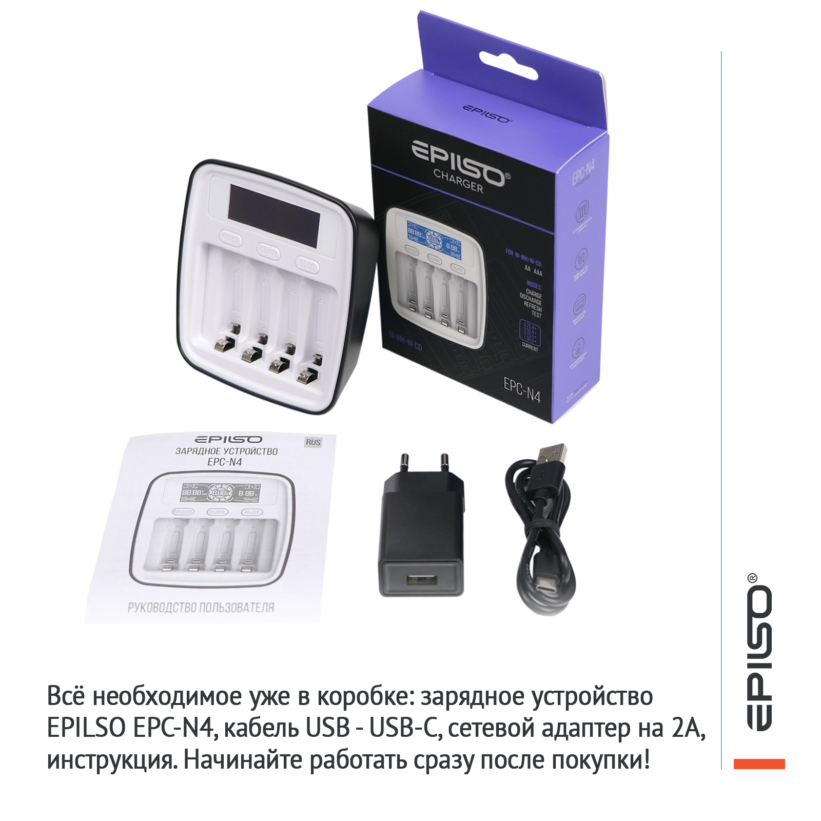 EPILSO EPC-N4 — это автоматическое зарядное устройство для аккумуляторов форматов AA и AAA типов Ni-MH (никель-металлгидрид) и Ni-Cd (никель-кадмиевые). Его ключевое преимущество — наличие четырёх независимых каналов, что позволяет заряжать, разряжать и тестировать каждый аккумулятор индивидуально, независимо от состояния соседних.